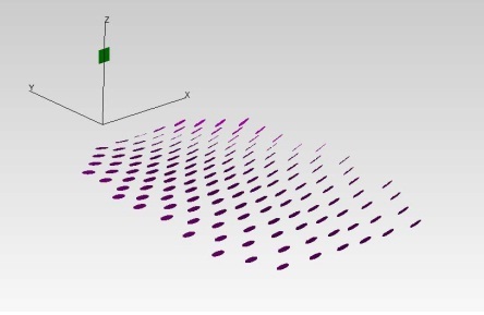 I campi solari tipo CSP (Concentrated Solar Power) sono sostanzialmente un insieme di specchi (chiamati anche “eliostati”) che si muovono per riflettere sempre verso il ricevitore la radiazione solare. Il numero e la superficie degli specchi possono essere molto diversi da campo a campo, ma in linea di massima su un singolo ricevitore si concentra l’energia riflessa da una superficie totale specchiata variabile da qualche centinaia ad alcune migliaia di m2. In Fig. 1 è mostrato lo schema base di un campo CSP: in rosso scuro, in primo piano, gli eliostati, ed in verde (sull’asse Z) la superficie ricevente. Così sul ricevitore si produce uno “spot” in cui si concentra la radiazione riflessa dagli specchi.