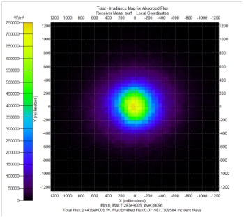 La dimensione dello spot sul ricevitore dipende, oltre che dalle caratteristiche degli eliostati, sia dalla divergenza solare (cioè dal fatto che la radiazione solare non proviene esattamente da un’unica direzione) sia dalle inevitabili tolleranze costruttive dell’impianto (per esempio, dalla effettiva planarità degli specchi); ambedue causano un allargamento del fascio diretto verso il ricevitore, e su questo lo spot prodotto dai raggi solari riflessi dagli specchi non sarà né un punto né un cerchio o rettangolo definito, ma una figura ovale o circolare che sfuma verso l’esterno (cioè una specie di gaussiana). In Fig. 3 si può vedere la simulazione di uno spot prodotto sul ricevitore.