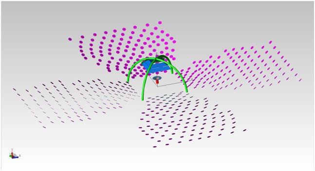 Fig. 1: modello di un campo CSP beam-down: in viola gli eliostati, in azzurro gli specchi di rimando situati in cima alla struttura verde di sostegno, in rosso il ricevitore, in blu la corona che delimita l’ingresso del ricevitore