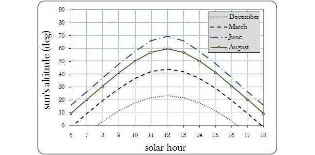 Nella figura sottostante è mostrato un esempio di calcolo della posizione del sole durante le varie ore della giornata per la latitudine di Firenze nei mesi di marzo, giugno, agosto e dicembre.